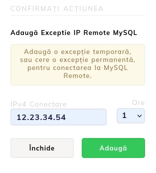 Procedura de adăugare a unui IP în lista MySQL remote poate fi găsită în articolul: Aktywacja MySQL zdalnego z konta klienta Hostico
