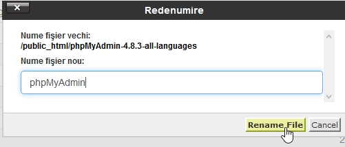 - nowy katalog o nazwie odpowiedniego archiwum, ale bez rozszerzenia .zip, pojawi się w katalogu public_html. Ten katalog musi zostać przemianowany, aby pozostała tylko "phpMyAdmin". Zmiana nazwy odbywa się poprzez zaznaczenie danego katalogu i naciśnięcie przycisku "Zmień nazwę" na pasku u góry strony.
