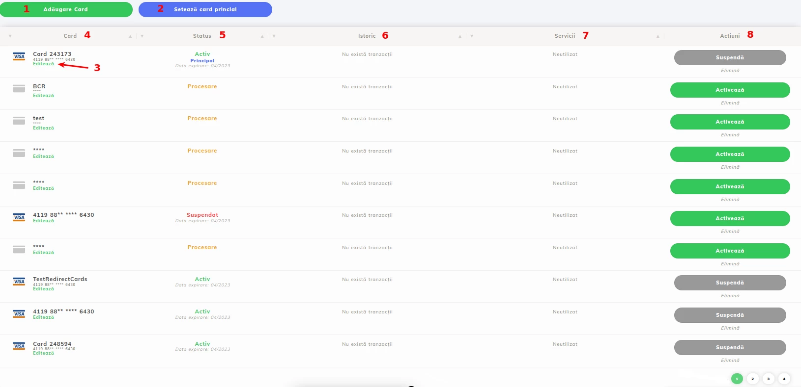8. Wymienia akcje Aktywuj / Zawiesź / Usuń karty
