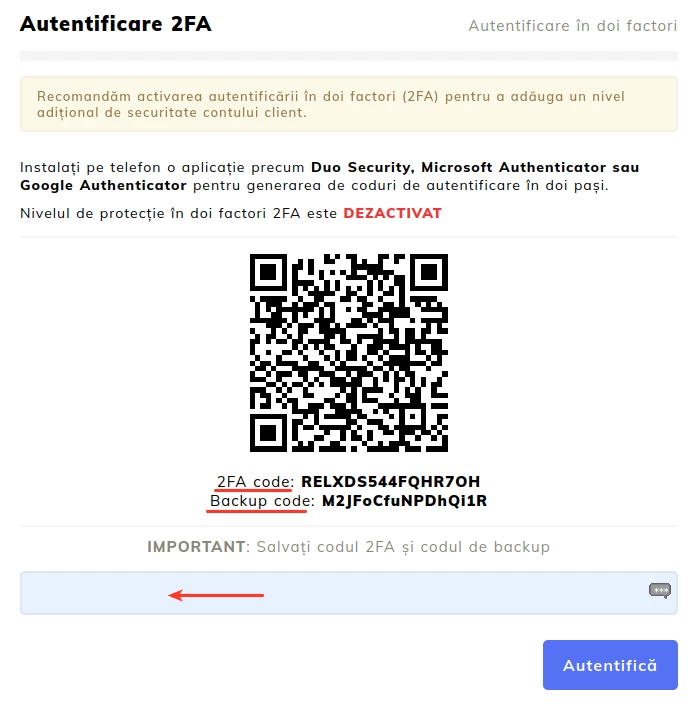 Po skonfigurowaniu aplikacji, aby zakończyć aktywację 2FA, musisz wprowadzić pierwszy 6-cyfrowy kod wygenerowany przez aplikację w polu wskazanym czerwoną strzałką na poniższym obrazie.