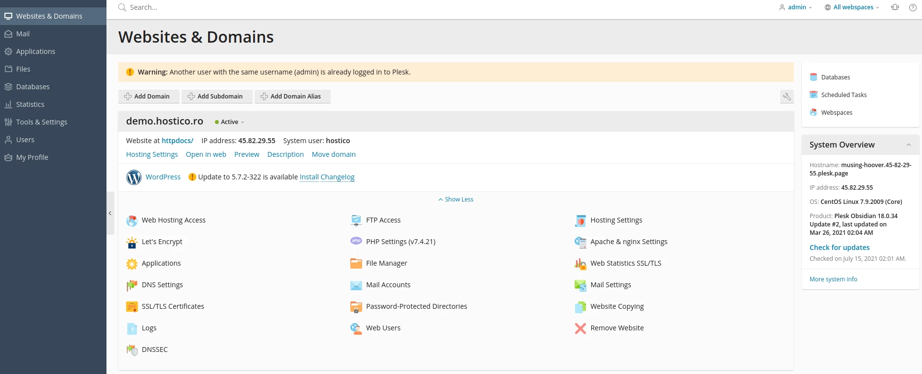 - Jeśli proces uwierzytelniania był udany, otworzy się strona panelu sterowania Plesk dla odpowiedniego hostingu.