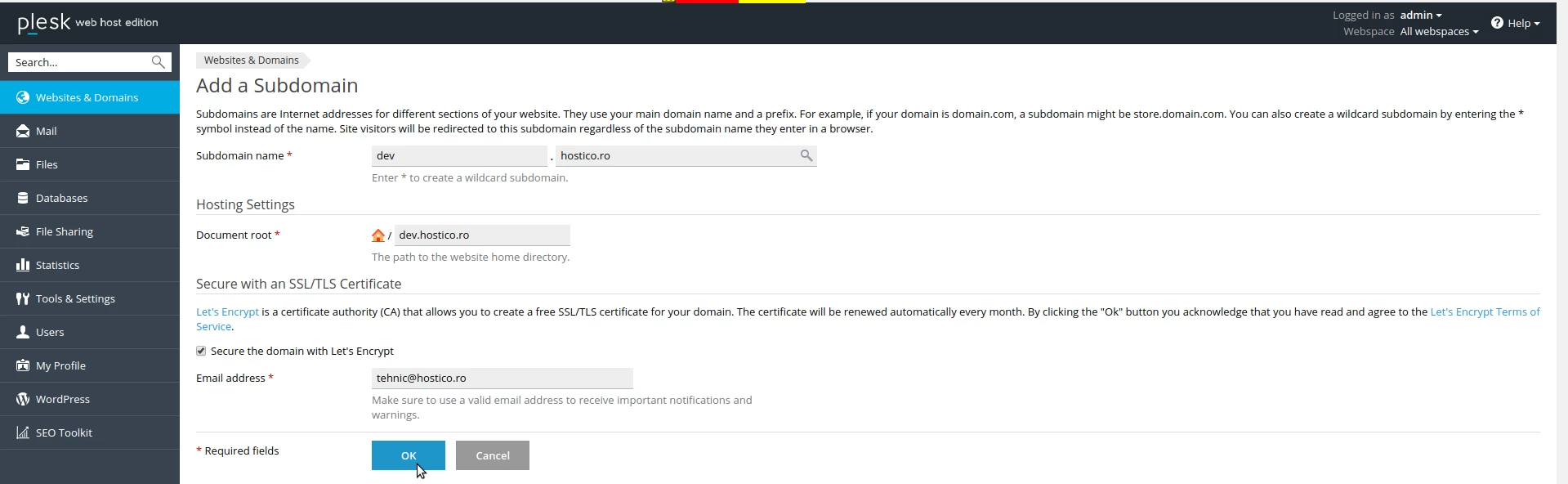 - Tutaj możemy ustawić ścieżkę do plików, Document root oraz zabezpieczyć subdomenę za pomocą Let's Encrypt.