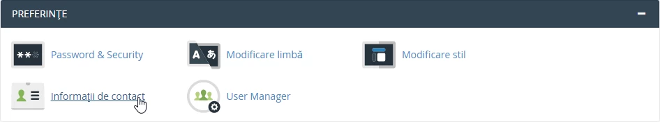 - Aby włączyć powiadomienia w koncie cPanel i zmienić informacje kontaktowe, zalogujemy się na konto cPanel, przejdziemy do sekcji Preferencje i klikniemy na Informacje kontaktowe.