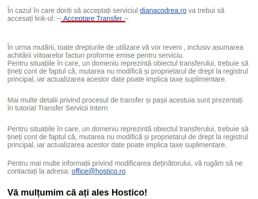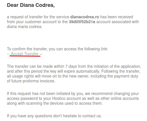Beneficjent otrzyma wiadomość e-mail na adres konta klienta Hostico z prośbą o Akceptację transferu.