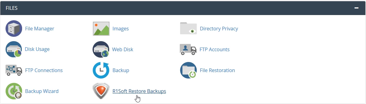 - Po uzyskaniu dostępu do panelu sterowania przejdziemy do sekcji Pliki i klikniemy na R1soft Przywróć kopie zapasowe.