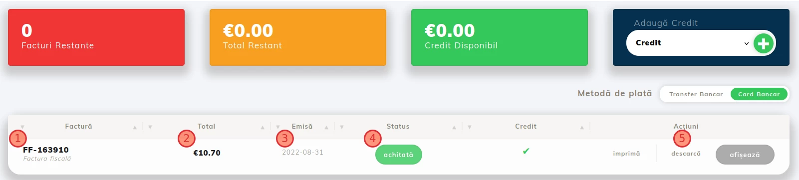 - Następna strona wyświetli istniejące faktury w koncie klienta oraz ich status.