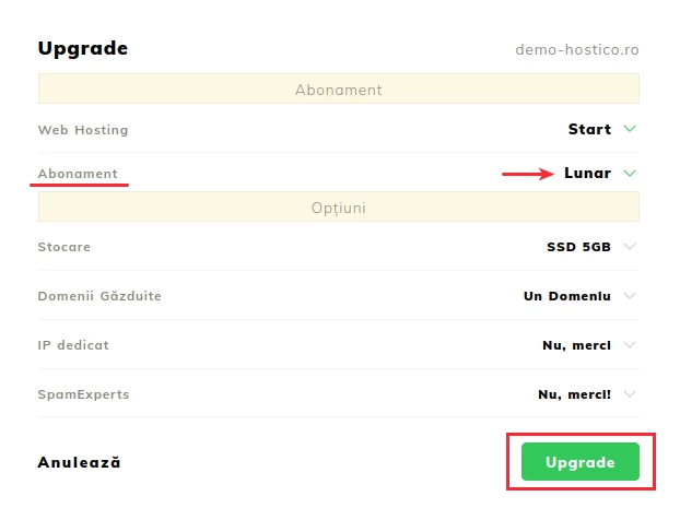 W nowo otwartym panelu przejdziemy do menu UPGRADE;- Sekcja Subskrypcja umożliwia aktualizację okresu rozliczeniowego pakietu hostingowego;