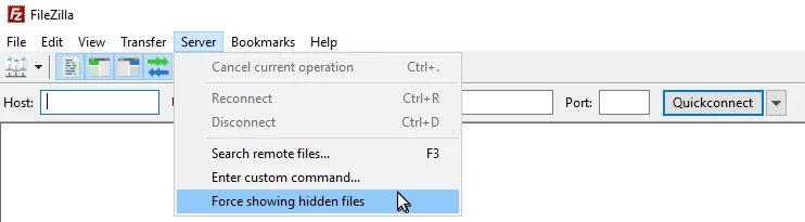 - Aby włączyć wyświetlanie ukrytych plików, kliknij na Serwery w pasku opcji w FileZilla, a następnie zaznacz opcję Wymuś wyświetlanie ukrytych plików.